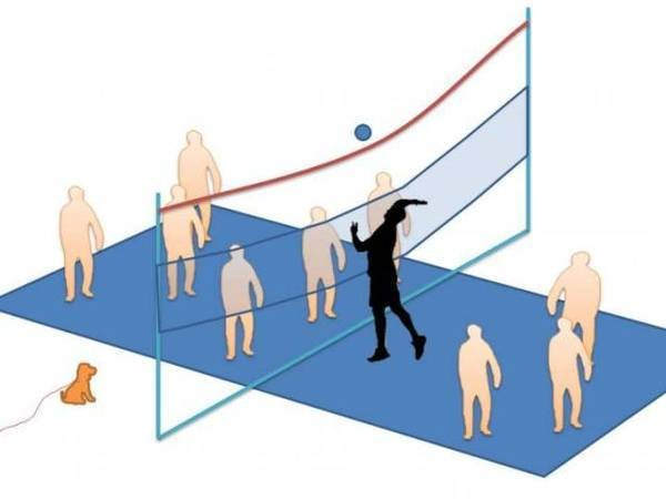 So Tekkrr, here I suggest modified rules: you are depicted black. I suggest you hang an additional rope (marked red) above the net. When you send the ball to the other side, the ball has to go over the red rope. This restriction applies only to you and Pleiadians. The players who are 5 to 6 ft tall are to send the ball over the regular volleyball net.
