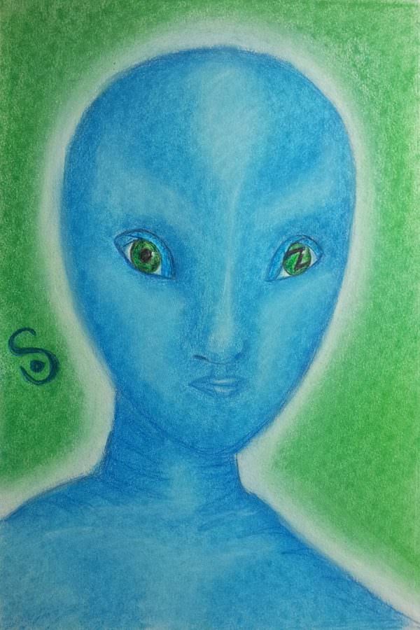 The day I did the portrait I got a very sudden thought that I should do it and that I would connect with one of my hybrid children really well. I used the technique as for some readings I do where I follow the lines that appear on the paper. For the first time ever the portrait started upside down, I wonder why it happened with her! I saw many eyes shapes that kept appearing all over the paper but there was one stronger presence. From the beginning she kept saying Zeta and with the Z in one of her eyes I guess she is part Zeta. It was an amazing feeling connecting with her, one I haven’t felt before. It was an amazing feeling of peace and love in my heart and the connection was very strong and personal. I asked how many other hybrid children I have and she said 30! I felt that she was the oldest. She has very healing energy.